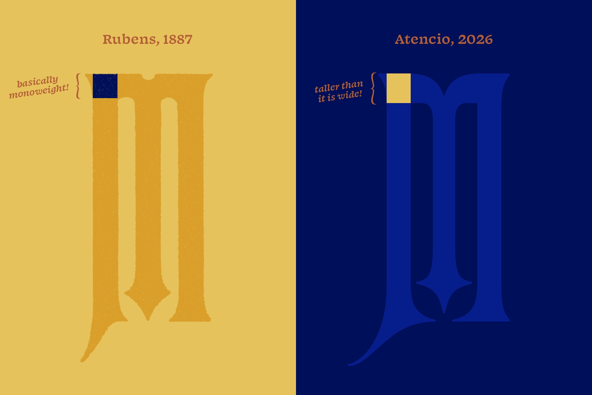 When we started working on Atencio, we prioritized the M rather than the typical H and O, as the M defines the style of Rubens. Our initial sketches were nearly identical to the original wood type, which led us to ask what the point was of making it all over again. Was our goal to merely create a better digital replica, or did we have more to say?