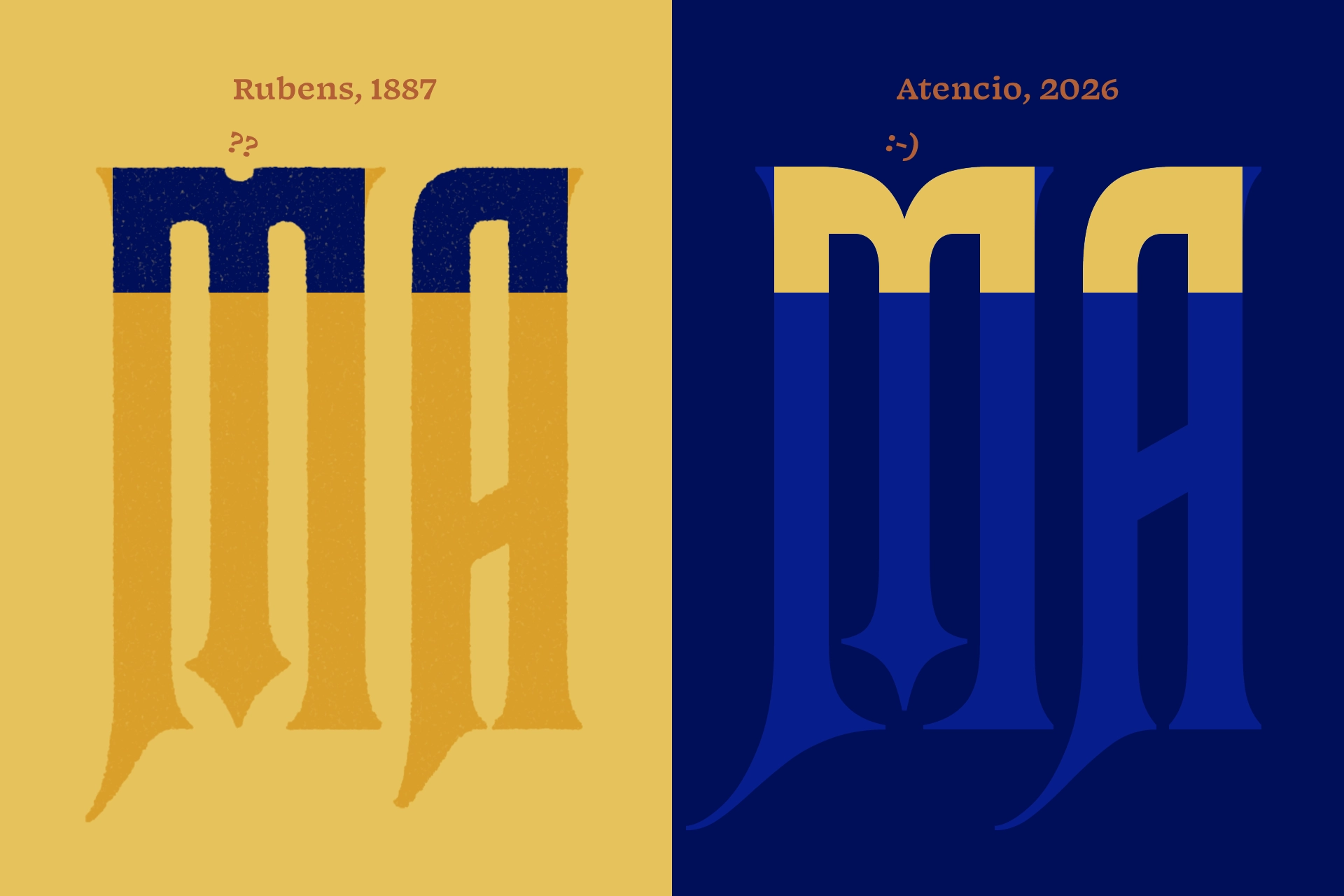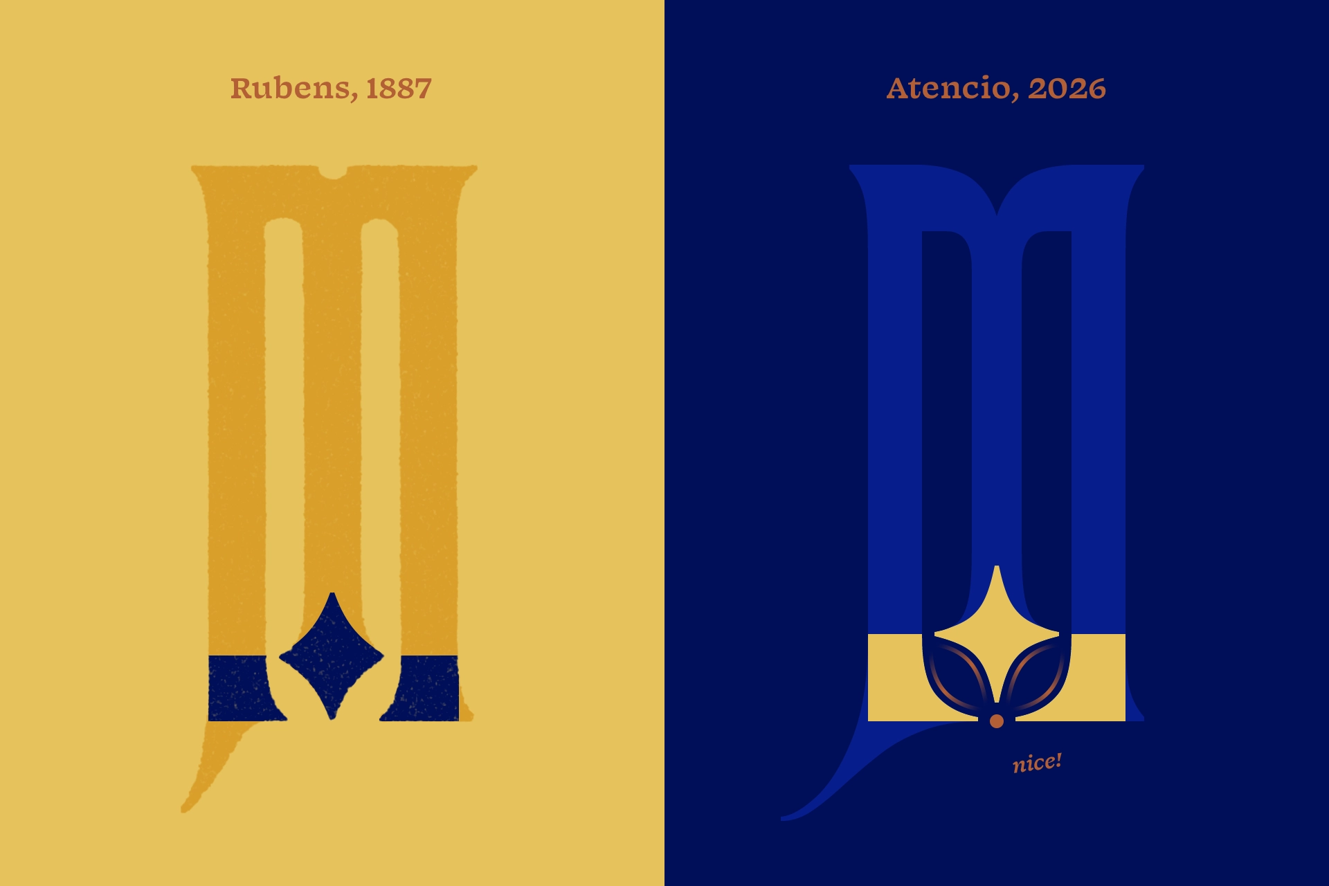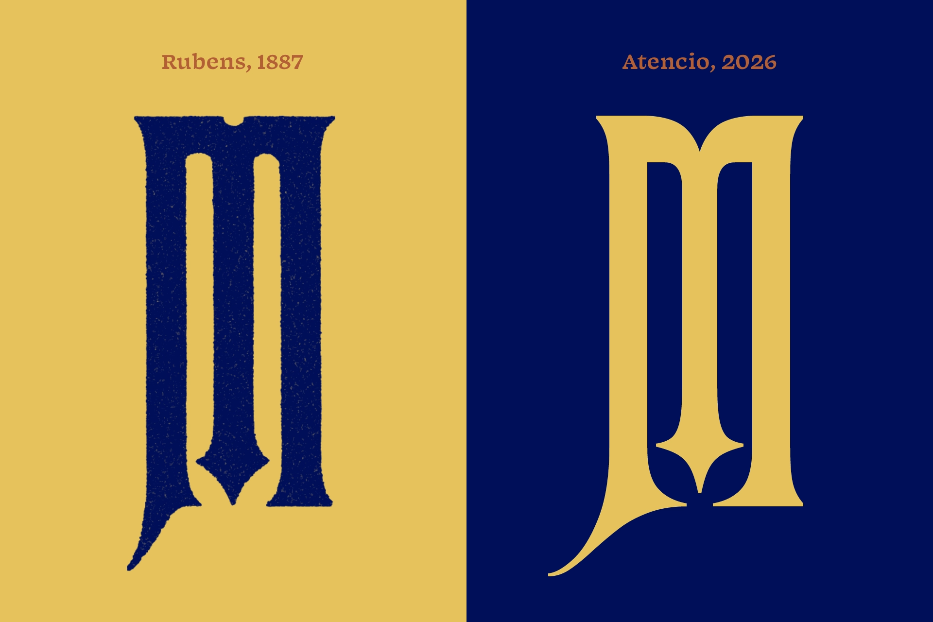 The Rubens M fully rounds its interior counters despite the exterior’s straight edges. Looking at the A, it becomes apparent that not all interior counters are rounded, but that they match their corresponding exterior corners, making the M a little bit of a rule-breaker. The curious circular cutout at the top of the Rubens M made its way into digitizations, though some have used a triangular cutout instead. The M in Atencio curves downward into the center stroke, with matching interior rounded corners.